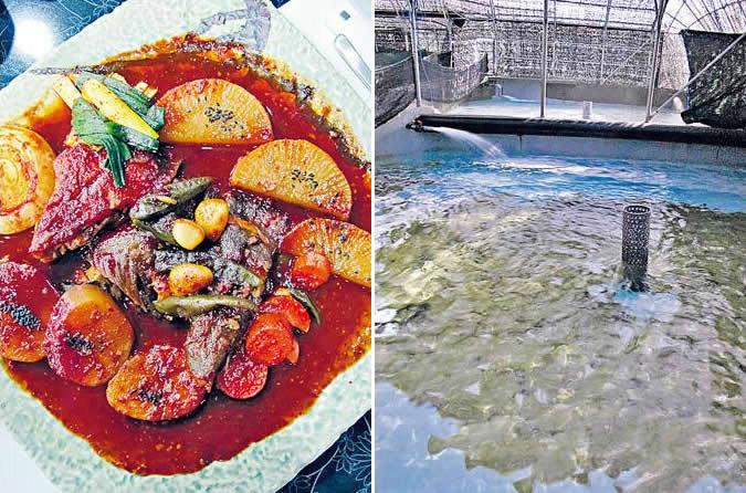 其中的濟州比目魚直銷公司便是抽取濟州海底岩石下 100 米的海水作養殖比目魚之用,經淨化後,再以恒溫定在 21 度最適合比目魚棲息的水溫來進行養殖。他們會從卵培殖至魚苗開始,繼而再分開不同的魚池來養殖。所吃的飼料由鯖魚加竹莢魚混合磨成粉,或經過一些特別處理過的大蒜和辣白菜乳酸菌等組合的天然飼料,大約 4 個月後,每條魚可達到 1 公斤重,到兩公斤以上便可供應到魚市場。聽說最重的可達 13 公斤,比目魚是愈重愈矜貴的。