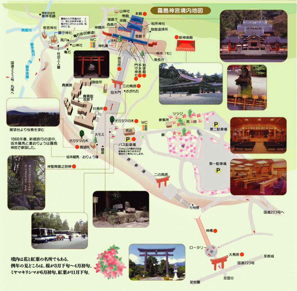 另外,遊客亦不能錯過霧島神宮中的三大鳥居,其中最外面的大鳥居高22.4公尺、兩柱間隔16公尺,為西日本最大。