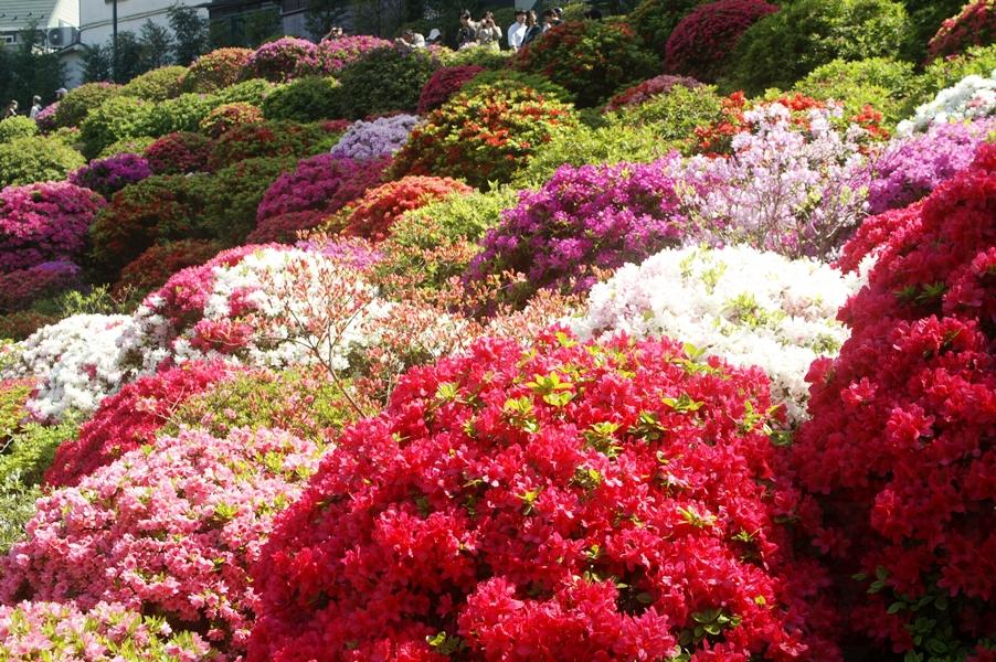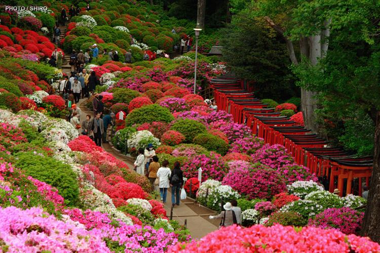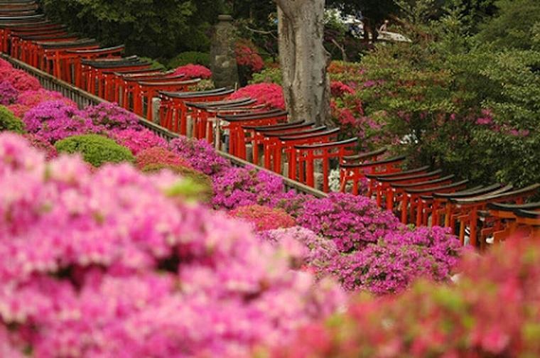 根津神社有一小排小型鳥居,從高處拍下來,畫面壯觀。其觀光旺季是每年 4 月左右的杜鵑花季,屆時種植於神社各種杜鵑花會百花齊放,不少日本人會特意前來觀賞,使根津神社熱鬧非常,不過平常,沒有太多人潮或觀光客,較為安靜。