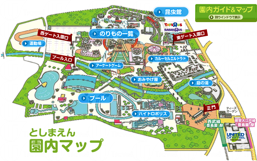 豐島園內共分為四大部分,分別為人氣最旺的水上活動區、瘋狂刺激的雲霄飛車區 、豐富多元的冒險遊樂區、以及專為兒童設計的兒童遊樂區,最適合全家老少一起來, 好好玩樂一個下午。
