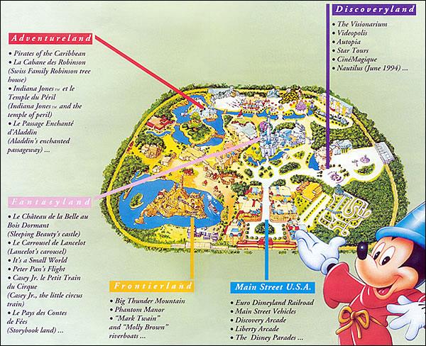 巴黎迪士尼樂園是迪士尼第四座迪士尼樂園,其所在的度假區則是第四個迪士尼度假區。巴黎迪士尼樂園分為五個主題園區,包括:美國小鎮大街(Main Street.USA)、冒險世界(Adventureland)、邊域世界(Frontierland)、幻想世界(Fantasyland)及探索世界(Discoveryland)。