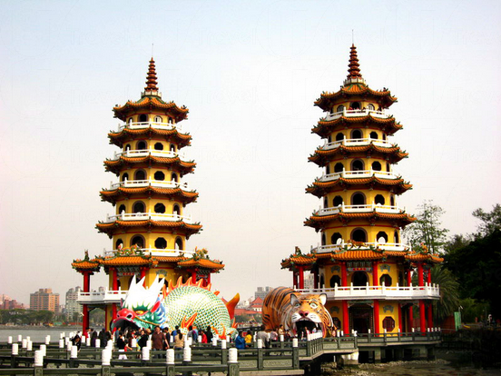 兩座樓閣分別都是四層八角並以九曲橋相互連結,綠瓦黃牆,宛如寶塔,是紀念關聖帝君的標地物,為當時全台塔中之冠;前有一尊騎龍觀音聖像,其由來有一傳說云:觀音菩薩乘龍現身於雲端,並指示信徒依其現身之形態塑造聖像在雙閣之間,特色獨具;春秋兩閣各有九曲橋相通,又稱「春秋御閣」,曲橋延伸與蓮池潭中的五里亭相連輝映。