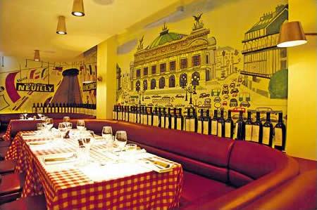酒吧旁邊的用餐區,就是鋸扒的地方,刻意打造成巴黎玩味的風格,紅色的皮革座椅、橡木牆身,以及掛滿一室的銅製燈罩,加上部分牆壁畫上藝術畫,更以法國童話做主題,故此可見到色彩繽紛的古老大街、老鼠揸車的畫像,充滿童真。