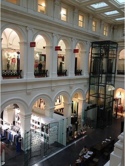 商場內部採用富麗堂皇的米蘭風格,大量採用玻璃修飾和自然光;採用拱廊形式,從伯爾克大街一直延續到小伯爾克大街(Little Bourke Street),是世界上最長的拱廊街之一。