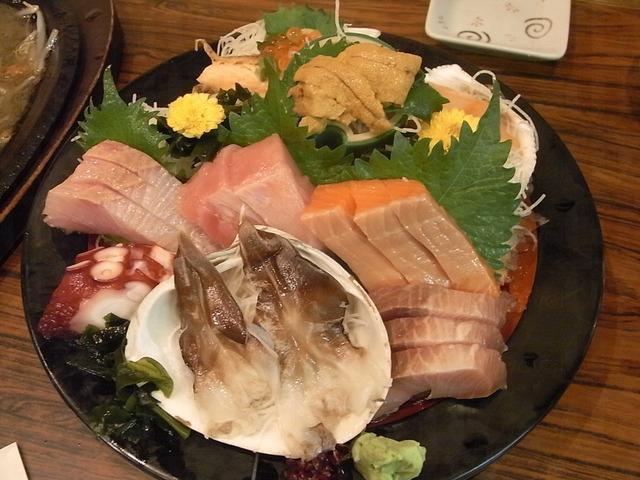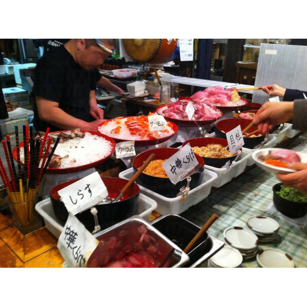 位於地庫中的太鼓茶屋 (たいこ茶屋),午間已有如和風料理店晚間那種情緒高漲的熱烈氣氛,淡黃燈光下的木質家具更為親切。這裡以 1100 日圓「刺身食べ放題」做招徠自然更有吸引力,顧客每人先選雜錦刺身或蔥漬吞拿魚一款,另有2、3款時令剌身及熱食任取,如薯餅、漬物、米飯、蔬菜等。