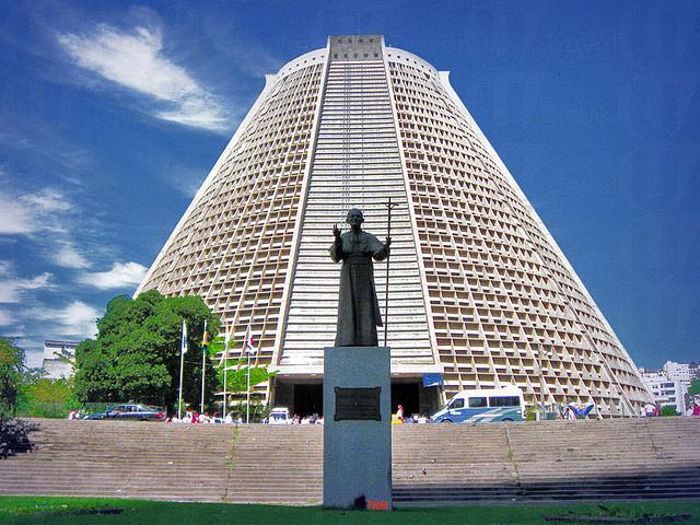 里約大教堂又被稱天梯教堂,始建於1964年,1976年落成使用,可容納約 2 萬人。教堂高 75 米,和一般常見的歐洲古老典雅的教堂大大不同,這是一座相當現代化的摩登建築,外形更像高樓大廈,教堂正門前放了教皇保羅二世的塑像,而左側則是頂端豎立著十字架的鐘樓。建築群莊嚴肅穆,教堂內部則四端都以通透的彩繪玻璃窗裝飾,特別的建築風格顯得獨樹一幟。