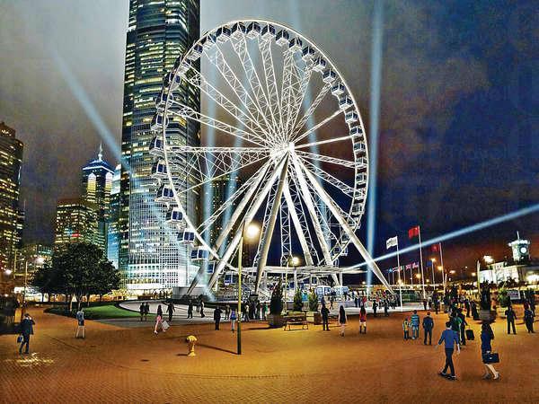 維港新地標、坐落中環九號碼頭旁的的摩天輪 Hong Kong Observation Wheel,預計會於今年 (2014年) 10 月投入服務,摩天輪收費成人每程 $100,小童及長者 $70。摩天輪高 60 米,轉一圈約需 15 至 20 分鐘,設有 42 個每個可容納八至十人的車廂車廂,包括其中 1 個貴賓廂。