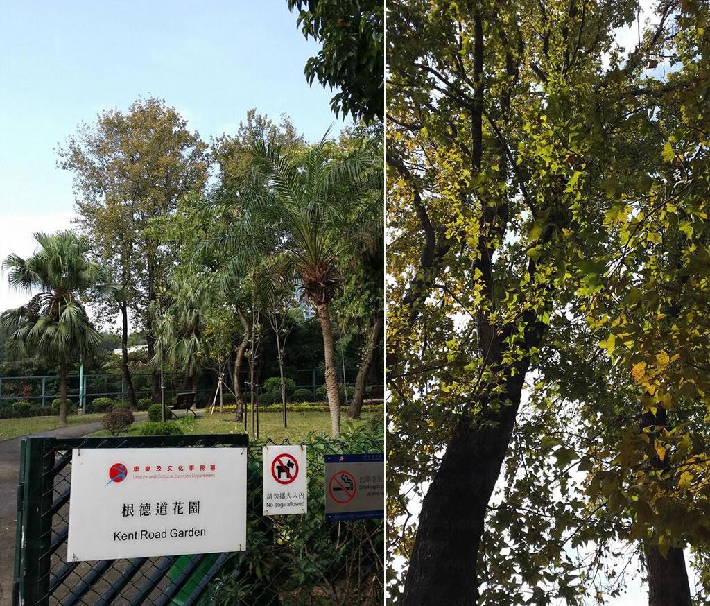 根德道花園面積不大,園內主要得一條緩步徑,但細心看,便會發現這個小小的公園卻種有一排為數十多棵的楓香樹。這排楓香樹只種在一邊,不能夠如動植物公園般形成一條楓香小隧道,可是由於這裡的楓香樹齡有老有嫩,一旦變紅,高矮層次分明,同樣壯觀呢!