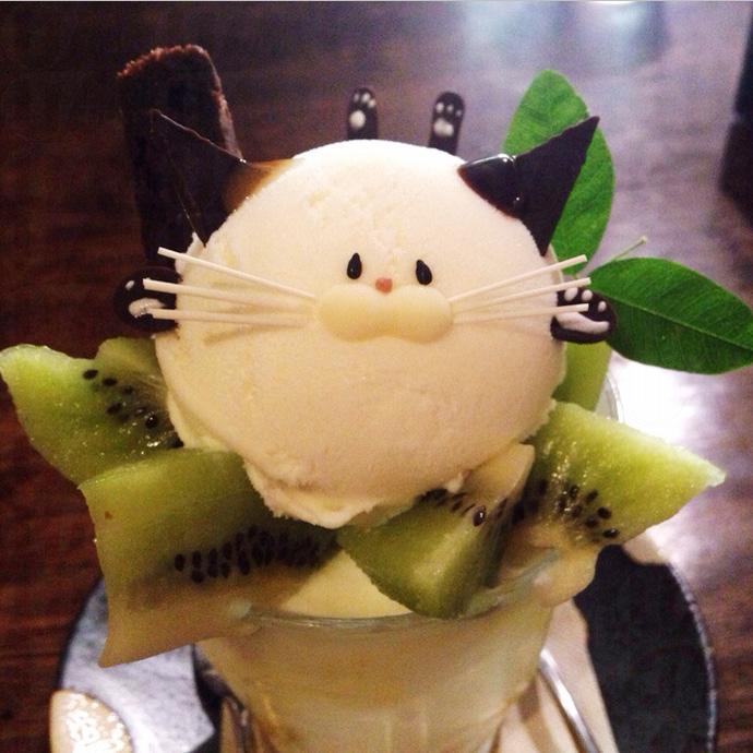 沒想到這樣懷舊的茶房,菜單上的芭菲竟是如此可愛,在圓圓的冰淇淋上,加上數筆,使它變成一杯被貓咪「棲息」的芭菲,令人無法忍心吃下去。