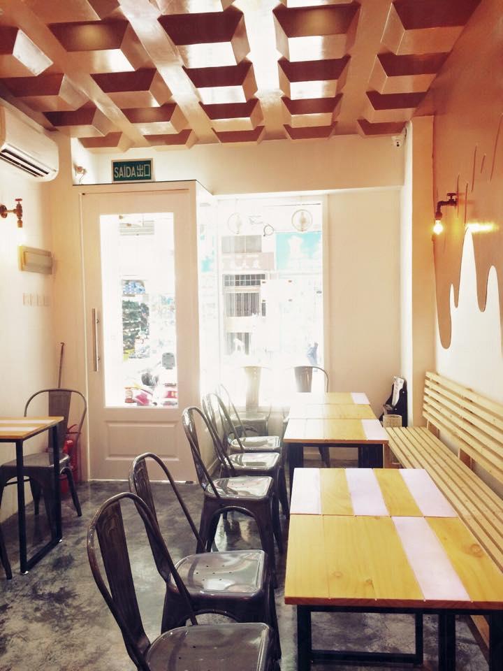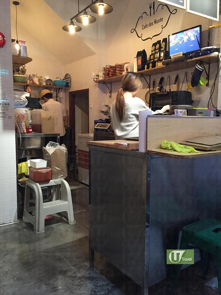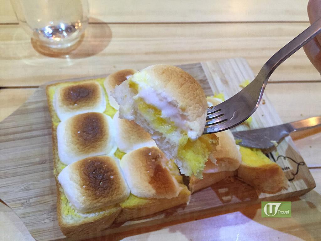 咖啡店提供多款飲料、餐點及甜品,其中棉花糖多士的造型新奇有趣,吸引不少客人點選。棉花糖多士上有一層金黃色的牛油,香氣濃郁,加上九粒香甜的棉花糖,配著多士一起吃,整體不會太甜膩。咖啡店的廚房是開放式的,客人可以看到食物的製作過程,而且更方便客人和老闆交流溝通,增添了一份親切隨意的感覺。