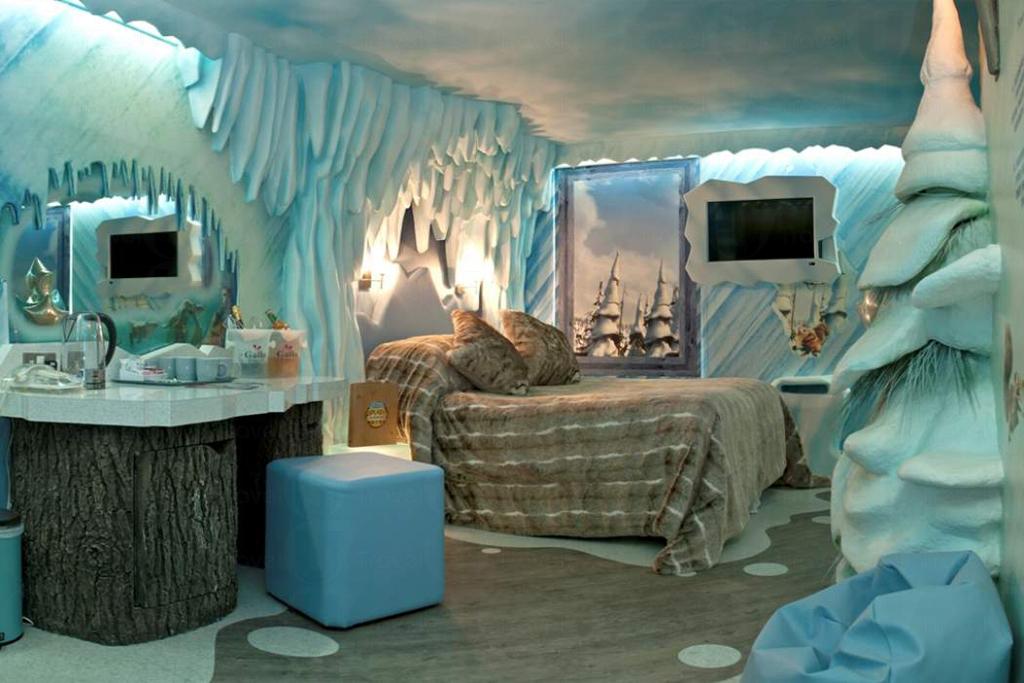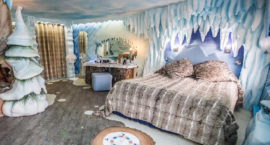 位於英國史塔福郡的奧爾頓塔旅館有多種主題套房,例如:海盜、阿拉伯、朱古力、Peter Rabbit等等,設計特別,佈置精美,吸引了不少客人入住。在眾多主題套房中,而當中以「冰河世紀」主題房詢問率特別高。 「冰河世紀」主題房根據電影「冰河世紀」的場景和角色佈置,整個感覺就像走進了冰河世紀的場景。藍白色的色調,營造出可愛版的極地環境,加上仿皮草設計的毛毛寢具,就像回到原始世界,跟主角一同居住。 此外,房間牆上也可以看到很多「冰河世紀」中的角色,一定滿足到這部電影的粉絲。
