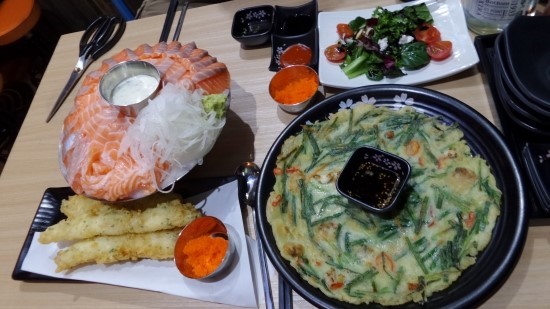 餐廳有兩種套餐,14900韓圜(約HK$99)的套餐包括三文魚刺身、海鮮煎餅、炸魷魚和芝士沙律,除了沙律,其他都可以無限添吃,而16900韓圜(約HK$113)的套餐則多了三文魚蓋飯,同樣可以無限添。