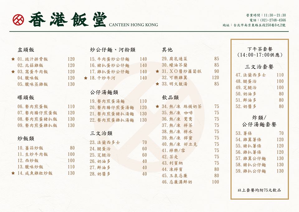 詳細介紹 台北松山區開了一間以港式美食為主題的「香港食堂」,雖仍在試營運,但已大受好評,不少台灣網民在香港食堂的粉絲專頁留言表至,「再也吃不了其他港式餐廳了...」、「無敵美味 道地香港料理」等,使此店大受注目。 菜色有盅頭飯、碟頭飯、公仔麵、三文治、忌廉溝鮮奶、茶走、鴛鴦等,各種特色香港美食和飲品,身為一個香港人,怎能不去「挑機」一下!而且據說「老闆帥菜又讚,這種店要上哪找?」,更加多一個理由造訪呢。