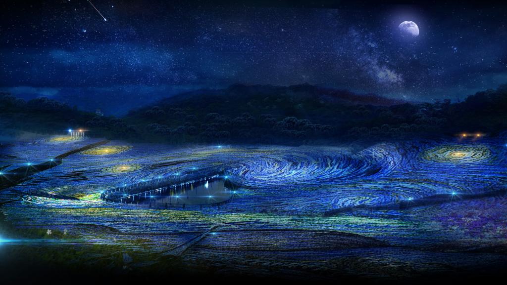 這個星空草原用了半年作準備,以塑膠瓶為畫布,用這種獨特的方式,把這幅名作展現於人前。不管是白天或入黑,兩者都散發截然不同氛圍的美感,壯觀而令人驚嘆。