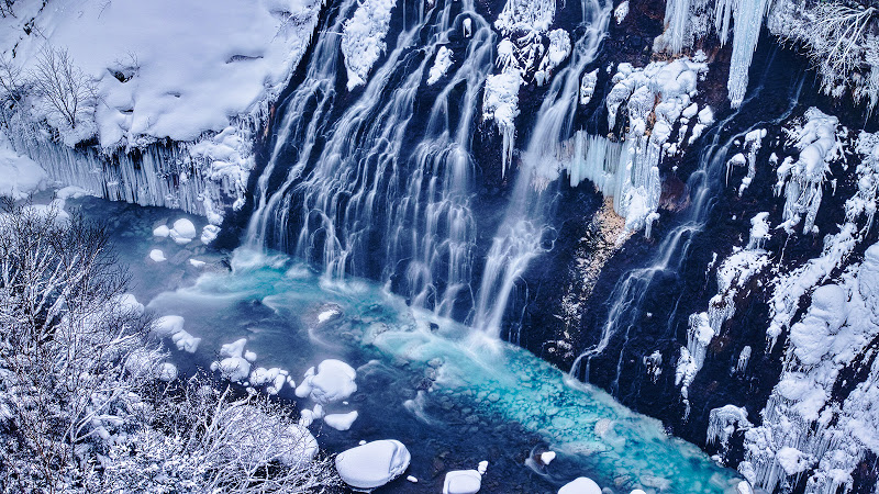 白鬚瀑布 (白ひげの滝) 是北海道三大名瀑布之一,位於北海道美瑛白金溫泉區,被稱為北海道必看到景色。 白鬚瀑布是由白金溫泉從石縫滲出,形成瀑布,與其溪水混合,從而變成夢幻的青色。青而池的部分泉水也是來自白鬚瀑布,白鬚瀑布泉水清澈而呈湛藍色,流進美瑛川,再流到青池。