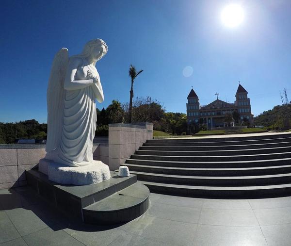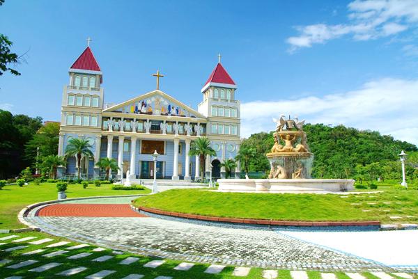 主建築教堂有歐洲圓柱、紅色三角錐頂、拱窗、富有色彩嘅仿歐洲壁畫等等,充滿古羅馬式、巴洛克式、洛可可式及哥德式建築特色。教堂對開嘅噴水池擺放咗幾款仿文藝復興時期嘅雕塑,都幾有味道。(圖:newbrue @pixnet)
