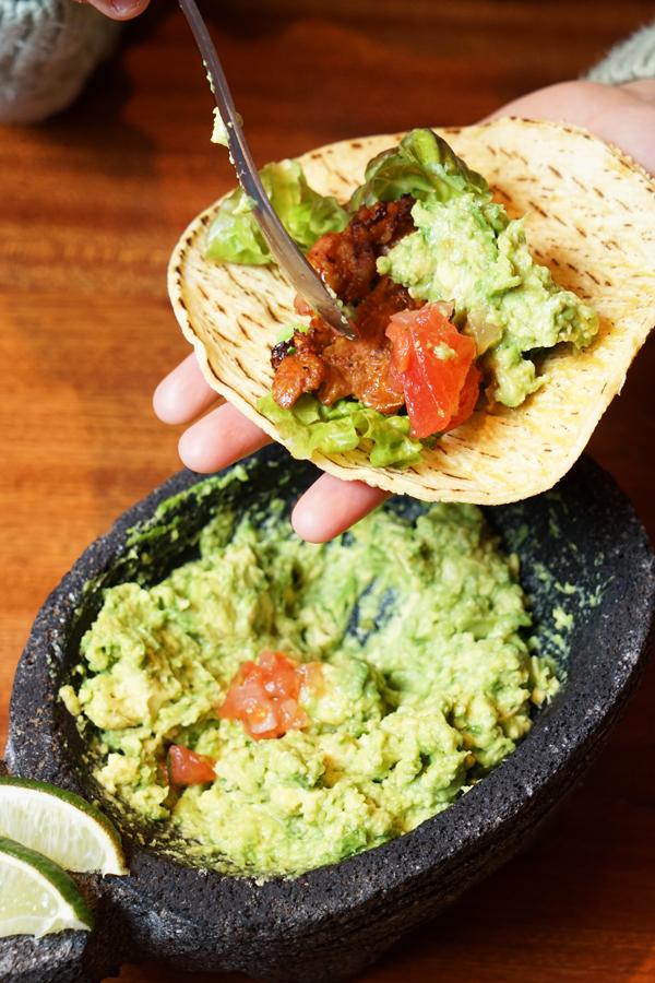 椿牛油果的豬仔石兜,是傳統墨西哥器皿,牛油果極軟腍,匙羹輕壓就變蓉,同配料 mix & match,非常過癮。