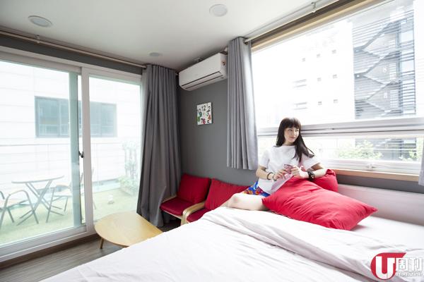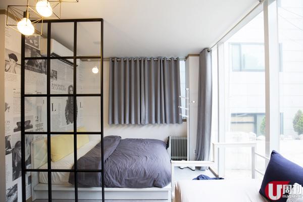 有落地大玻璃面向街景的型格設計房間,可住 2 至 4 人。