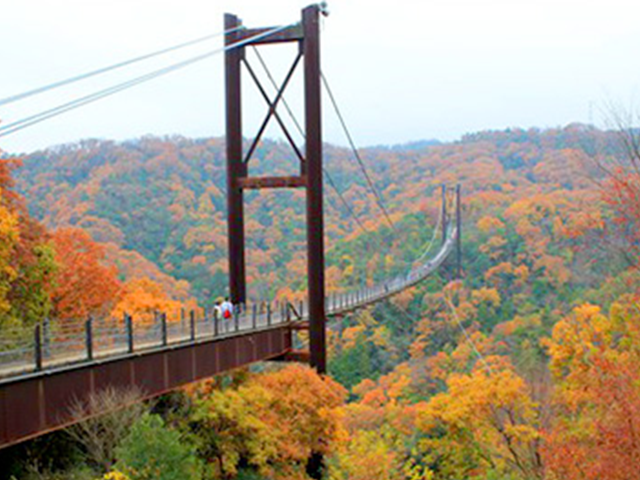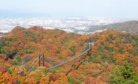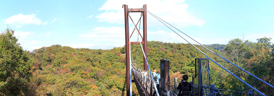 星田園地是位於東大阪的山邊的國立自然公園,園中的「星空中的鞦韆」之美稱的巨大吊橋是有名的賞楓景點,步行在吊橋上可以全方位地飽覽滿山盛開的紅葉,放眼四周盡是紅葉景色,視覺效果非常震撼!