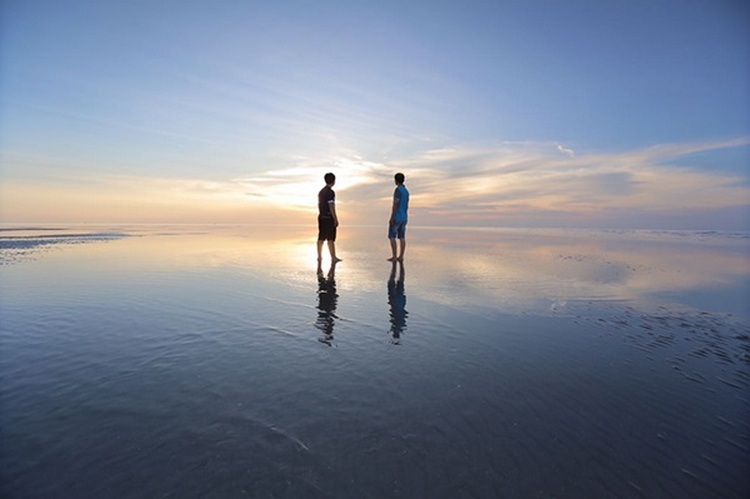馬來西亞的「天空之鏡」位於沙沙蘭漁村外海附近的一個神秘海島之中。每逢海水潮退之時,就會形成一個淺灘,淺灘面積頗大,而且在海的中央周圍無半點遮擋,清徹見底的海水反映藍天白雲,海天一色連成一線,美得像一幅畫!
