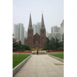 徐家匯天主教堂是上海教區的主教堂,建於 1896 年,是座法國中世紀的磚木建築,紅色的外牆是其標記。教堂樓高五層,主堂的左右兩邊是歌德式的鐘樓設計,而在天主堂正門前屹立著四聖史的像,整個設計令人歎為觀止,有如置身法國的教堂一般。教堂可以容納 2000 多位教徒,是上海的天主教會進行大型彌撒的重要場地。此外,在教堂旁邊是徐家匯天主教堂的藏書樓,內有閱讀室及藏經樓,只限於星期六開放兩小時。