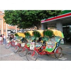 一步出旗津輪渡站,即會看到旗津的觀光三輪車,現在全台灣只剩旗津還保留這古老的交通工具。旗津三輪車觀光路綫是從輪渡站出發,經旗津路、區公所、海產街、臨水宮到中洲路,最後再返回輪渡站,來回趟新台幣 200 元。辛苦的車伕有男有女,年齡都在頗高,但都算健步如飛。遇上特殊節日或活動,他們還會統一換上特色裝扮,把三輪車裝飾一番。遊客可選擇搭三輪車到特定地點,或遊一圈。坐在三輪車上,邊和車伕聊天,邊看着旗津熙來攘往的人群,耳邊傳來店家的叫賣聲,恍如回到過往的年代,別處可找不到的,當然,也不要忘了跟車伕合影,留下難得的紀念。