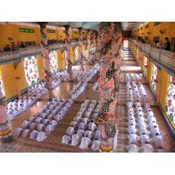 在越南的高台教信徒人數約有 300 萬人,高台教都是僅次於佛教和天主教的越南第三大宗教。它是各種宗教的一種綜合體,並將在越南盛行的東西方各種宗教:佛教、天主教、基督教、道教、儒教全都揉和在一起。位於越南西寧市的高台教廟宇其建築風格體現出中西宗教合壁的主要特點,它既有兩座類哥特式教堂的高大的尖塔,同時亦融入了中國傳統建築風格,廟宇內豎立了兩排雕龍的圓柱,廟內兩旁有「天眼」,象徵人們任何事情都逃不開高台神眼的審察。在高台教廟宇的供桌上,供奉來源於各個宗教的神像,最高層是釋迦牟尼,左右分別是老子和孔子;第二層則是觀音,第三層是耶穌,還有其他東西方聖賢的神像,如孫中山。廟內每天有四次禮拜儀式,,分別為上午 6 點、一般參加了由胡志明市出發的旅行團都能觀看 12點開始的儀式。