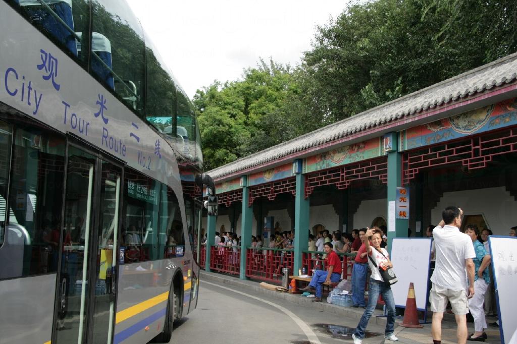 自 08 年 6 月通車後,作為兩條觀光巴士線總站的北官廳就經常排起長龍。雙層觀光巴士上層前排最吃香,可以隔窗大拍特拍沿途風景,全車 58 個座位附小桌方便吃喝,沿途有講解員以中英文介紹途經景點。以古都風貌為主題的觀光 1 路,於 1 小時車程內欣賞天壇、天安門、故宮、鼓樓等,2 路則經過鳥巢、水立方、國家體育館等主要奧運場館和設施,行車 45 分鐘。有別於他城的城市觀光巴士,行車路線非循環線,下車後須重新購票,故大多數人選擇坐足全程不下車,寧願足不出車坐到底。