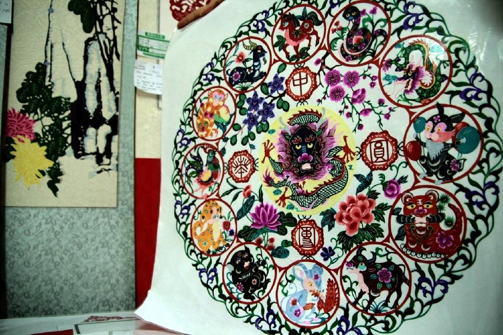 剪紙是一種古老而迷人的民間藝術,形象設計離不開農業社會的祥瑞圖案,對大自然和神明充滿敬畏和愛護之情。做工精細的剪紙是由剪紙師一刀刀手工刻出來的,而不是剪出來的,彩色的比黑或紅色單色的工序來得複雜,價值便有所差異。細心翻看,福字、囍字、十二生肖、龍鳳吉祥、名著人物的圖案以外,兒童童話故事、老北京街景、人像等圖案更添生活感,有興趣把自己的圖片變成一幅剪紙,大可與店方議價。
