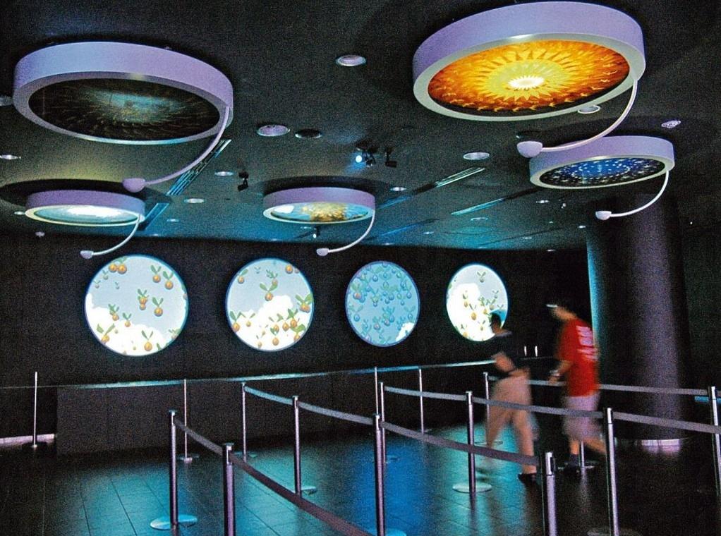 體驗區由地庫開始,大廳以紫色作主調,天花裝有 10 多個圓形,各有不同圖案在旋轉,由太陽、月亮、星空、白雲、雨雪等組成,都是天空的表情。至於後面的 Time Screen,分別有 6 個不同主角現身,其中白色像雨點的就是主角小天天。