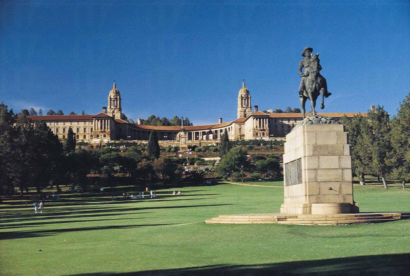 這座建築物的奠基石在開工 3 年後的 1913 到位,整個總統府座落在比勒陀利亞一座可以俯瞰全城的小山上,它的前面是整齊、優美的花園,園中立有不同的紀念碑和雕像,至於後面就有大片的松林和灌木區,裡面有很多不同的鳥類棲息,遊客可在此感受到總統府的威嚴和氣勢,同時也可在鳥語花香的花園到處閒逛,拍照留念一番。