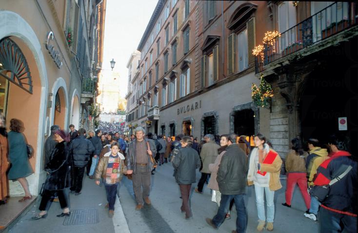 羅馬有 3 條著名的購物大道,Via Borgognona、Via Frattina 及 Via Condotti。而位於西班牙廣場 (Piazza di Spagna) 附近的 Via Condotti,可謂 3 條購物大道中最有名的一條,這裡簡直就有如羅馬的名店街。