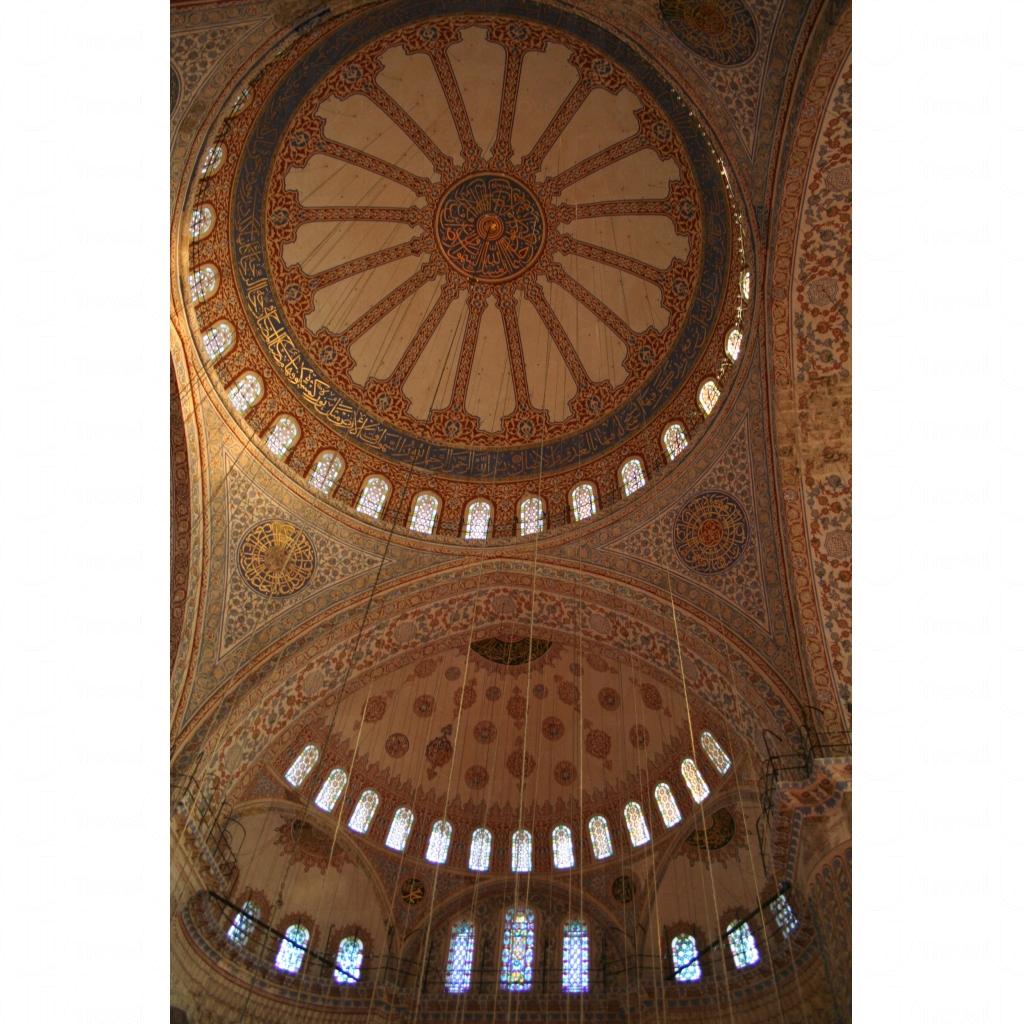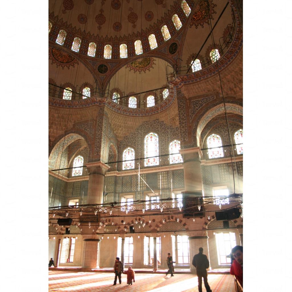走進寺內,長長的迴廊繞着中庭,向上一望是頂高達 43 米的大圓頂,宏偉而華麗,充份表現出鄂圖最的建築風格。因內部以藍色的瓷磚裝飾為主,故使這座特別的清真寺得名為「藍色清真寺」。