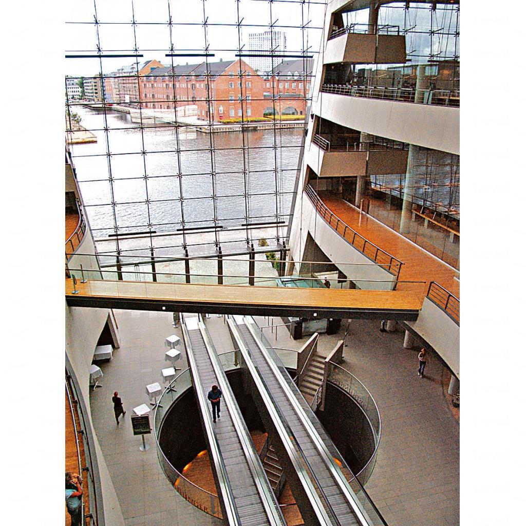 找到了喜愛的書藉後,更可從電梯直上,欣賞此處的建築藝術。再沿通道走向舊館,是一個與「黑鑽石」不盡相同的古典世界,遊客可在樓層上眺望玻璃幕牆外的港灣景色。遊丹麥皇家圖書館,確能讓人眼界大開。