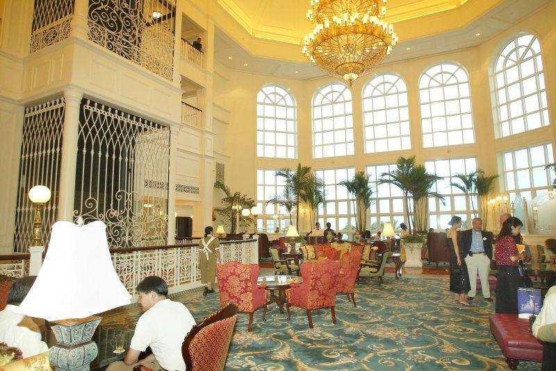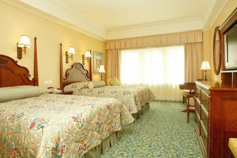 迪士尼樂園酒店屬維多利亞式的建築,四周布置富麗堂皇,內有 400 多間客房,並分不同等級,包括海景及園林景觀客房、海景陽台客房、夢幻客房 、國賓廳客房及國賓套房,價格按不同日子而有所浮動。房間內的擺設盡是以迪士尼人物為主,設備齊全,遊客走進房內,有如置身一個童話世界中般。