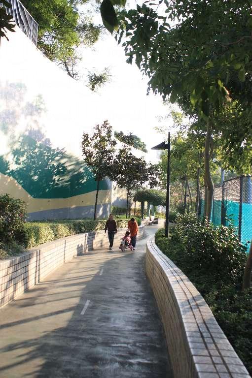 1期以運動設施為主,有方便坐輪椅人士的斜道,有兒童Playground,緩跑俓,門球草地等,四周都種了樹木,有長木椅供市民休息。