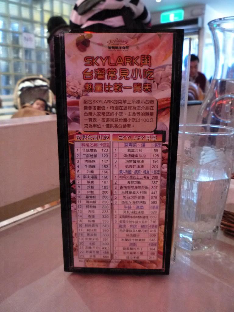 Skylark 餐廳第一間分店位於台北繁華的忠孝復興路,店內的室內設計舒適寫意,而且空間寬敞,令食客得以放鬆身心,屬約會或與親友聚餐的好去處。此外,餐廳的菜單上更設各種食物的圖片,並陳列出相關的卡路里,令顧客能掌握更多資訊,作出合適的選擇。
