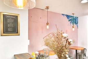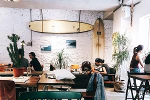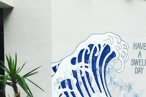 以滑浪做主題的 SWELL CO. CAFÉ,入店前,必定會被門口的浪花圖案的石屎牆吸引,繼而自拍打個卡,而店舖設計都滿陽光與海灘 style,好似原木大枱、仙人掌盆栽及大大塊的滑浪板作為牆上裝飾。
