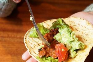 店子唯一做的「牛油果放題」,是僅將牛油果去皮切半,客人只需用石椿,將已經軟腍香熟的牛油果,椿至稀巴爛,然後加鹽、青檸調味,再以 taco、生菜作底,抹上牛油果醬、番茄 salsa或辣蛋黃醬。