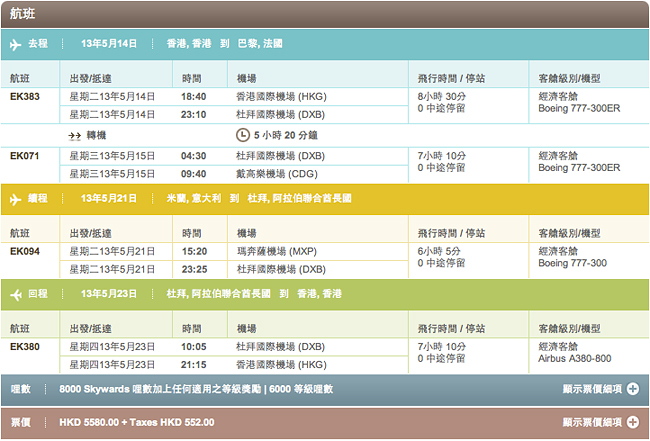 香港>>>米蘭 + 杜拜 連稅$6132 ($5580+$552稅)