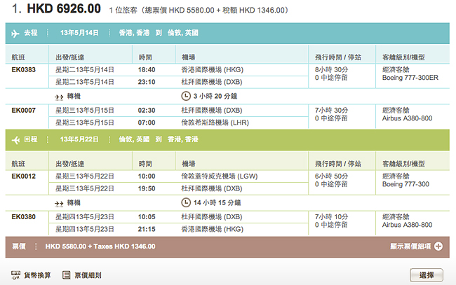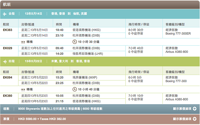 (參考:去程14/5 , 回程 22/5; 香港>>>倫敦(EK383+EK029) + 米蘭>>>香港 (EK094+EK380))
