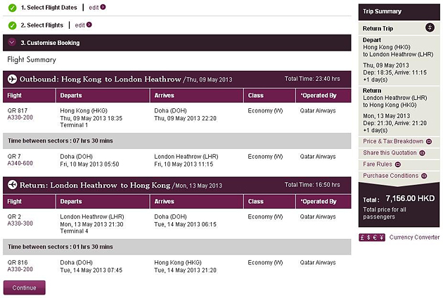 香港=>倫敦=>香港=連稅$7,156 ($2,210 + $4,946 稅)