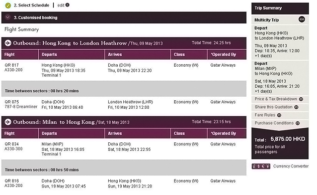 (參考:去程9/5, 回程 18/5; 香港=>倫敦(航班QR817+QR075) +米蘭=>香港(航班QR034 + QR816))